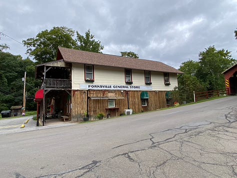 Although the Burr arch trusses are supported by steel beams, the state has deemed weight limits. The state has issued a sufficiency rating of marginal, begging for a major overhaul. Traveling west from Route 154 and heading to the Forksville General Store,