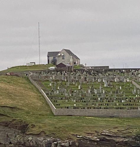 Cemeteries are along the coast as many residents are fishers and wish to reside by the sea. Windswept turf and peat bogs scattered with sheep, sheep on the left, sheep on the right, and from time to time a Shetland pony. Roads are narrow and everyone seems to know almost everyone else.